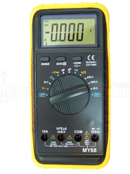 Цифровой мультиметр MY68 – это удобное переносное устройство для измерения таких показателей, как сила постоянного и переменного тока, постоянное и переменное напряжение, сопротивление, емкость, частота, а также для тестирования диодов и прозвонки электрических цепей. Все измерения (кроме силы тока) производятся с автоматическим выбором пределов. Прибор отличается высокой точностью. Технические характеристики: Разрядность дисплея: 3 3/4; Максимально индицируемый параметр измерений: 3260; Количество измерений в секунду: 2-3; Постоянное напряжение: 326 мВ / 3,26 В / 32,6 В / 326 В / 1000 В; Точность (пост. напряжение): ±0,3%-0,5%; Переменное напряжение: 3,26В / 32,6В / 326В / 700В; Точность (переем. напряжение): ±0,8%; Постоянный ток: 0,326мА / 3,26мА / 32,6мА / 326мА / 10 А; Точность (пост. ток): ±1,2%-2%; Переменный ток: 0,326мА / 3,26мА / 32,6мА / 326мА / 10 А; Точность (перем. ток): ±1,5%-3%; Сопротивление: 326Ом / 3,26кОм / 32,6кОм / 326кОм / 3,26МОм / 32,6МОм; Точность (сопротивление): ±0,8%-1,2%;