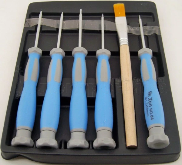 В наборе 5 отвёрток длиной 14см: 1) Пятиконечная звезда 0.8 x 50мм 2) T5 x 50мм 3) T6 x 50мм 4) Крестовая 1.5 х 40мм 5) Крестовая 1.2 х 40мм Антистатическая кисть